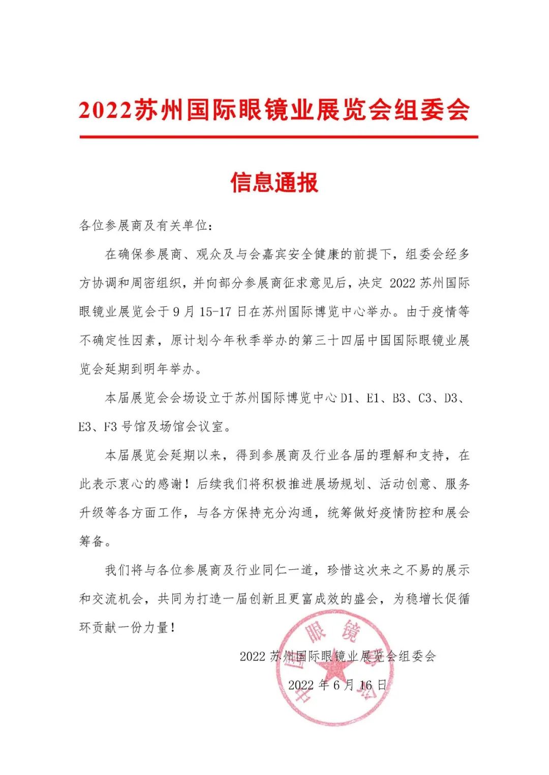 2022苏州国际眼镜业展览会重新定档9月15-17日在苏州国际博览中心举办。由于疫情等不确定性因素,原计划今年秋季举办的第三十四届中国国际眼镜业展览会延期至明年举办。距离开展已不足100天,小编特此将展览、参观、报名的最新消息打包奉上,想要参展、观展的新老朋友们抓紧报名!