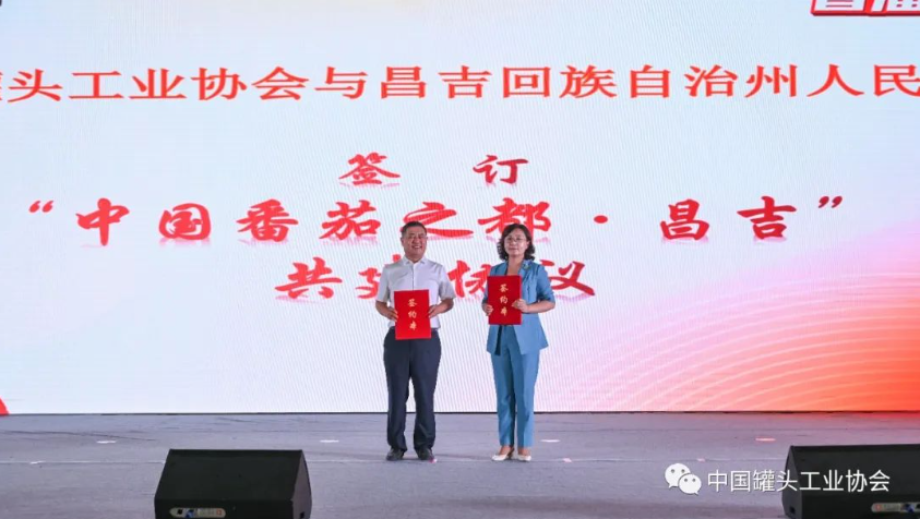 会长张崇和、农业农村部食物与营养发展研究所党委书记、副所长、国家食物与营养咨询委员会副秘书长王晓举、中国烹饪协会会长杨柳分别致辞,他们在致辞中均表达出对中国番茄产业良好发展势头的乐观期待,对番茄产业高质量发展的殷切期望以及对以番茄罐头为首的番茄制品行业未来健康、可持续发展的美好祝愿。之后,中国罐头工业协会理事长刘有千作为主办单位的负责人进行了讲话。他在讲话中强调中国罐头工业协会以促进行业高质量发展为己任,责无旁贷地担起了引领行业发展的艰巨使命,精心策划和实施举办了首届番茄节。这个节庆活动不论是对于中国罐头工业协会行业地位和影响力的树立,还是对于昌吉州的经济发展推动都具有十分重要的意义和相当深远的影响。中粮糖业控股股份有限公司总经理助理、董事会秘书、中粮屯河番茄有限公司党委书记、总经理郭顺杰也在发言中表示中粮屯河番茄有限公司愿共同探讨番茄产业的发展趋势和合作机会,为新疆经济社会发展和乡村振兴做出更大贡献。开幕式中,中国罐头工业协会理事长刘有千与昌吉回族自治州人民政府副州长苏晓莉双方交换了共建“中国番茄之都·昌吉”的协议书,共同推动昌吉番茄产业集群的建设,带动昌吉一二三产业的协同发展。随着首届番茄节LOGO和吉祥物的精彩亮相,八位重要领导和嘉宾共同按下了启动键,在庄重又热烈的气氛中,宣布首届番茄节正式开幕。