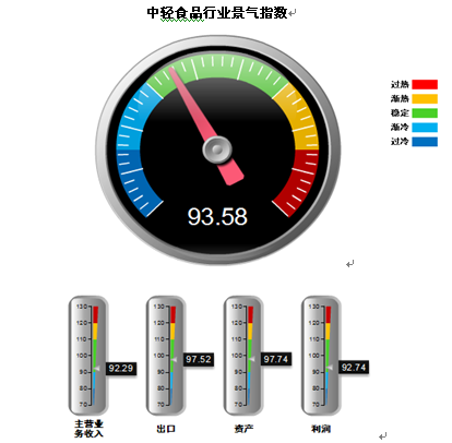 2013年11月份中轻食品景气指数为93.58。食品景气指数仍处于绿色稳定区间。具体的分项指数为:主营收入景气指数92.29、出口景气指数97.52、资产景气指数97.74、利润景气指数92.74。
