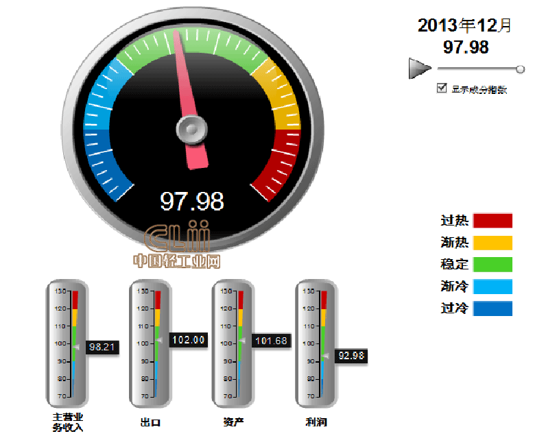 发布2013年12月中轻照明景气指数。12月,中轻照明景气指数97.68,其中:主营业务收入景气指数为98.21,出口景气指数为102.00,资产景气指数为101.68,利润景气指数为92.98(图1)。