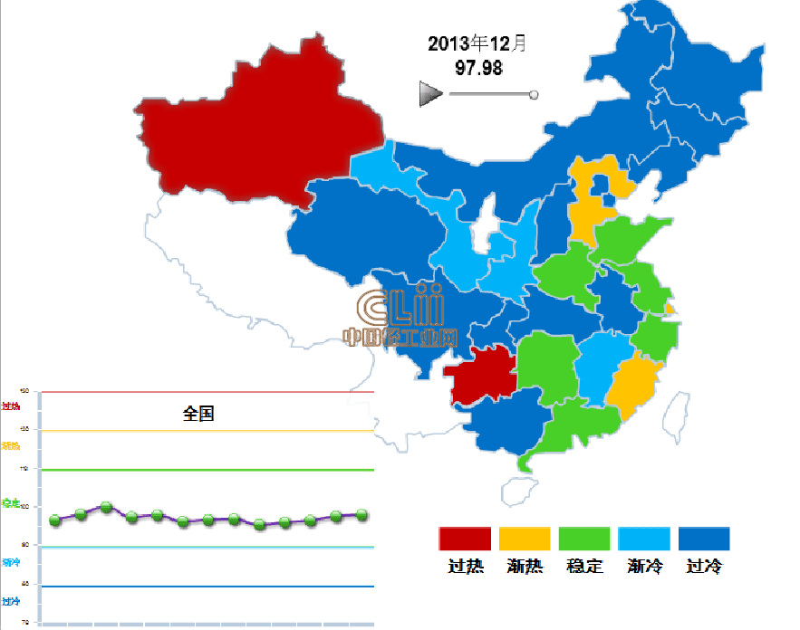 12月,处于“稳定”区间的地区有6个,分别是:山东、河南、安徽、湖南、浙江、广东,占全国的19.35%。处于“过热”区间的地区有2个,分别是:新疆、贵州。处于“渐冷”区间的地区有3个,分别是:江西、陕西、甘肃。其它地区均处于过冷状态(不含西藏、云南、宁夏、海南)(图3)。