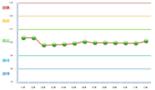 图1 2012.11—2013.12自行车行业产值景气指数变化态势
