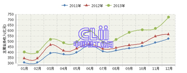 图1 2012年11月~2013年12月家具行业主营业务收入景气指数变化态势