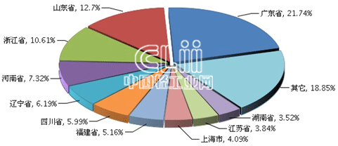 2013年,家具行业累积主营业务收入居全国前10位的地区依次是广东、山东、浙江、河南、辽宁、四川、福建、上海、江苏及湖南,与2012年的排名相同。其中,广东、山东与浙江3个地区合计占全国家具行业累计主营业务收入的占比稳定在45%(图6);与2012年相比,上述10个地区中,只有广东的占比扩大了1.48个百分点,其他9个地区的占比都出现了收窄。
