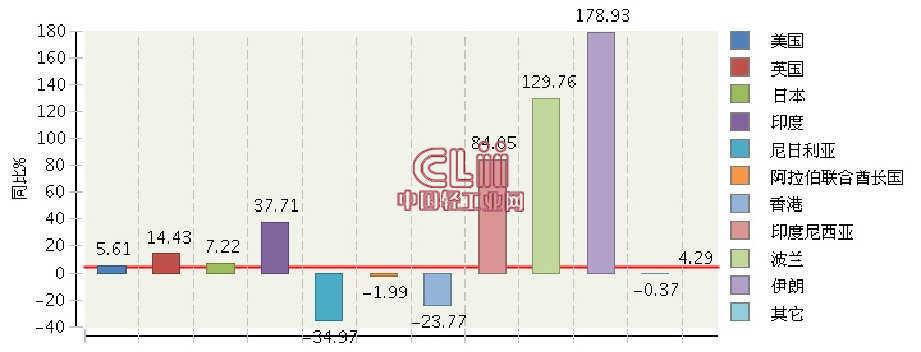 2013年全国白炽灯泡行业累计出口额主要贸易国同比增长情况