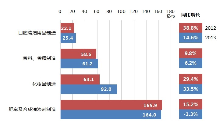 从各子行业完成利润增长情况看,除化妆品制造行业保持超过30%的高速增长外,口腔清洁、香精香料制造行业均有不同程度下降,肥皂及合成洗涤剂制造行业完成利润较2012年下降1.3%。