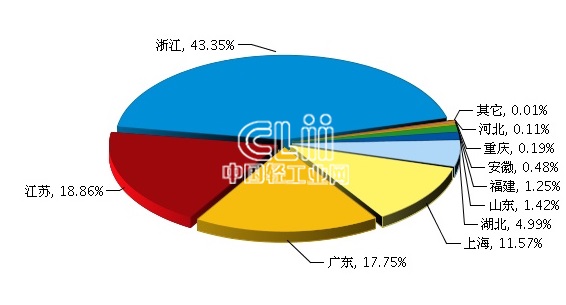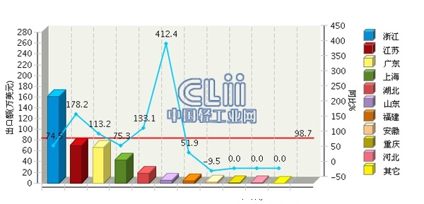 2013年,全国卤钨灯对希腊累计出口额371.75万美元,同比增长98.73%。出口地区主要集中在浙江、江苏、广东、上海等地区。其中浙江完成累计出口额161.15万美元,占全国总出口额的43.35%,各地区出口额所占比重见图1。从增速情况看,山东同比增长412.42%,居全国首位。