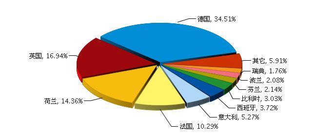 图:2013年我国乐器行业对欧盟出口额贸易国占比情况