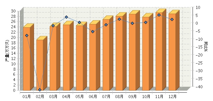 根据国家统计局公布数据,2013年全国原电池及原电池组(折R20标准只)行业累计完成产量311.94万万只,同比增长3.46%。12月份完成产量28.92万万只,同比增长4.66%。2013年月度数据走势及同比增长情况如下图所示。