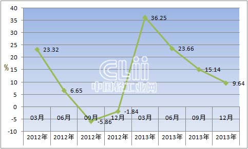 2012年到2013年,累计出口稳步上长升,2013年各月累计出口均高于2012年。从近两年分季度增速情况看,2013年一季度增速最快,为36.25%。