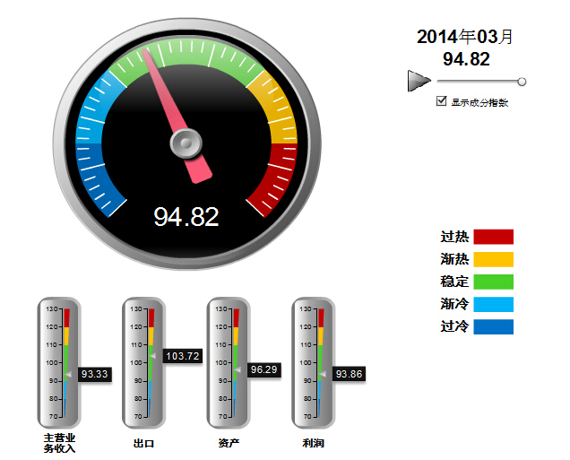 和中国皮革工业协会联合发布2014年3月中轻皮革景气指数。3月份中轻皮革景气指数94.82,较2月的93.65略升1.17个百分点。其中:主营业务收入景气指数为93.33,出口景气指数为103.72,资产景气指数为96.29,利润景气指数为93.86(参见图1、2)。