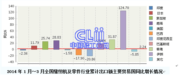 2014年1~3月,全国缝纫机及零件行业完成累计出口额4.36亿美元,同比增长2.24%。比重主要集中在印度、日本、新加坡、越南、美国、巴西、印度尼西亚、巴基斯坦、香港、伊朗、其它等地区。其中:印度完成累计出口额0.47亿美元(占10.81%),同比增长-2.36%;日本完成累计出口额0.36亿美元(占8.35%),同比增长11.79%;新加坡完成累计出口额0.36亿美元(占8.19%),同比增长25.74%;越南完成累计出口额0.32亿美元(占7.38%),同比增长28.83%;美国完成累计出口额0.29亿美元(占6.55%),同比增长-1.58%;巴西完成累计出口额0.18亿美元(占4.15%),同比增长-17.9%;印度尼西亚完成累计出口额0.18亿美元(占4.1%),同比增长-20.86%;巴基斯坦完成累计出口额0.15亿美元(占3.47%),同比增长18.64%;香港完成累计出口额0.14亿美元(占3.14%),同比增长31.87%;伊朗完成累计出口额0.12亿美元(占2.85%),同比增长124.7%;其它完成累计出口额1.79亿美元(占41.02%),同比增长-5.85%。