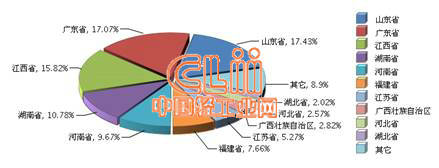 2014年1~4月全国陶瓷行业规模以上企业累计完成主营业务收入前三位地区依然是山东、广东、江西。其中山东累计同比增长13.75%,占17.43%;广东累计同比增长19.58%,占17.07%;江西累计同比增长17.21%,占15.82%,详见图2。