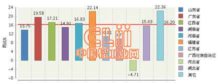 图3 2014年1~4月全国陶瓷行业累计主营业务收入主要地区同比增长情况