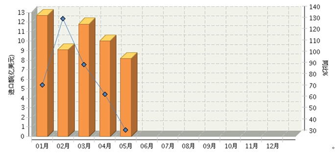 根据海关总署发布数据,2014年1~5月,全国食品行业累计完成进口额51.74亿美元,同比增长77.39%。其中: 5月份完成进口额8.15亿美元,同比增长35.67%。月度进口额及同比增长趋势如下图所示。