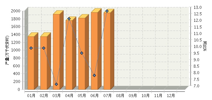 根据国家统计局公布数据,全国铅酸蓄电池行业累计完成产量12,746.11万千伏安时,同比增长9.66%。其中:7月份完成产量1950.88万千伏安时,同比增长12.99%。2014年全国铅酸蓄电池行业月度产量及同比如下图所示。