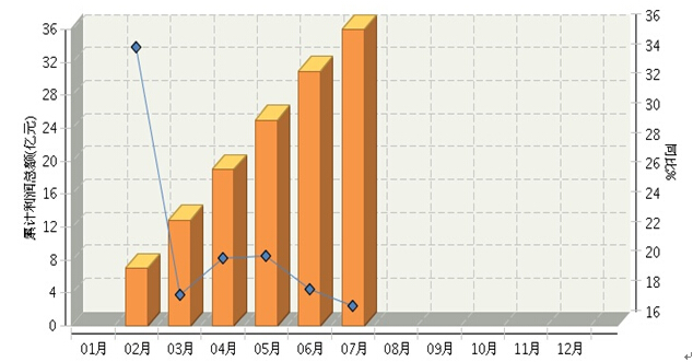图1 2013.6—2014.7自行车行业利润景气指数变化态势 2014年1月~7月,全国自行车制造行业累计完成利润总额35.95亿元,同比增长17.30%,增速比6月再次下降。自行车行业生产虽然增长放缓,但利润依然保持了相对较高的增速(参见图2)。 图2 自行车行业月度累计利润总额走势图 2014年7月,自行车行业规模以上企业累计利润总额达到35亿元,比去年同期增长17.30%。从子行业分布情况看,电动自行车行业利润规模超过脚踏自行车行业,但增速低于脚踏自行车行业。电动自行车行业累计利润总额达到22亿元,同比增长16.20%;脚踏自行车行业累计利润总额近14亿元,同比增长19.10%。