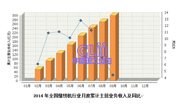 2014年1月~9月,全国缝纫机行业累计完成主营业务收入299.51亿元,同比增长4.91%。其中:1月~2月份完成累计主营业务收入52.7亿元,同比增长6.57%; 1月~9月份完成累计主营业务收入299.51亿元,同比增长4.91%。