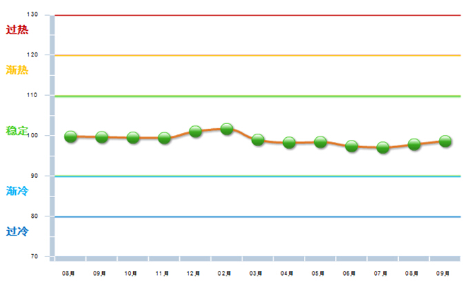 图1 2013.8—2014.9自行车行业主营业务收入景气指数变化态势