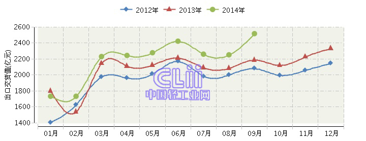 2014年全国轻工全行业连续三年月度出口交货值对比