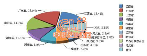 2014年1~11月全国陶瓷行业规模以上企业累计完成主营业务收入前三位地区依次是江西、广东、山东。其中江西、广东累计主营业务收入均超过500亿元:江西累计同比增长14.59%,占18.41%;广东累计同比增长17.46%,占16.94%。详见图2。