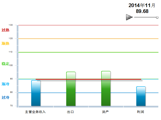 2013年10月至2014年11月,中轻皮革景气指数基本稳定,在90~100间小幅波动,处于稳定提示区的下半区运行。11月中轻皮革景气指数略低于10月(参见图3)。
