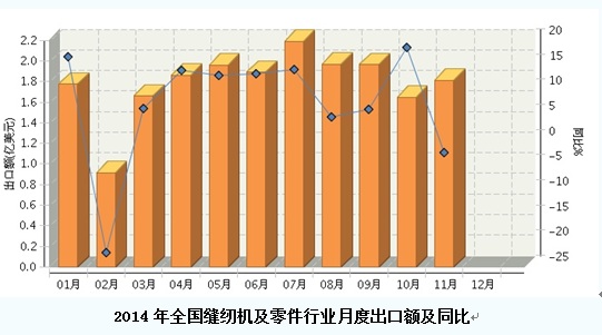 2014年1~11月,全国缝纫机及零件行业累计完成出口额19.66亿美元,同比增长8.01%。月度出口增速除2月、11月两个月为负外,其余月份均为正。出口较平稳。