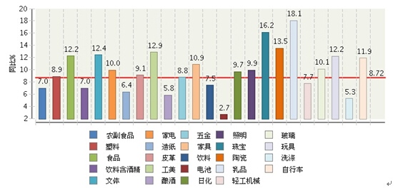 图 2014年1~12月全国轻工全行业累计主营业务收入重点行业同比增长情况