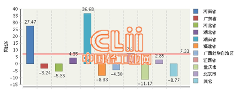 2014年全国卫生陶瓷制品累计产量主要地区同比增长情况