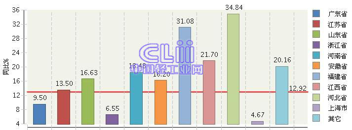 同期,前10个地区中,河北和福建的累计主营业务收入增速(下称“累计增速”)达到了31%以上的快速增长;江西、河南、山东、安徽及江苏5个地区的累计增速超过了平均增速12.92;而只呈一位数增长的地区为广东、浙江及上海3个地区(图2)。