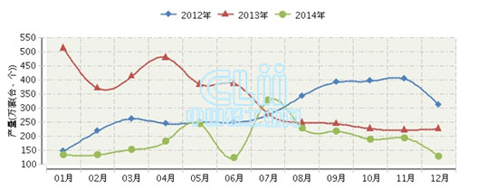 2014年山东灯具及照明装置行业连续三年月度产量对比