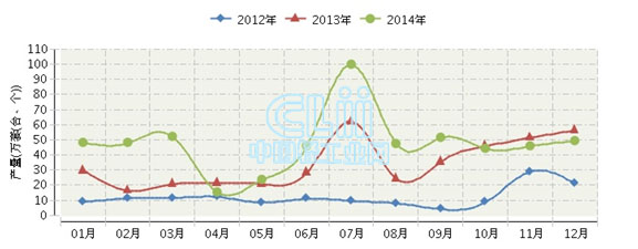 2014年天津灯具及照明装置行业连续三年月度产量对比