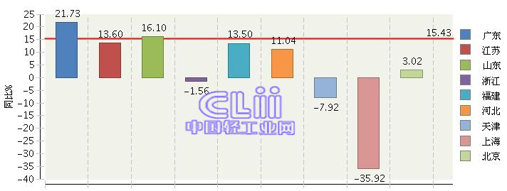 2014年,东部地区玩具行业完成累计利润总额78.36亿元,同比增长15.43%。广东与山东两个省区利润增速高于东部平均水平,其中,广东完成累计利润总额34.25亿元,同比增长21.73%;山东完成累计利润总额10.52亿元,同比增长16.1%;江苏与河北累计完成利润总额同比增长13.60%和11.04%;北京累计完成利润总额仅增长3.02%,值得注意的是,浙江、天津、上海三省(市)均出现不同程度的负增长,尤其是上海全年利润总额增速较去年下降了35.92个百分点。