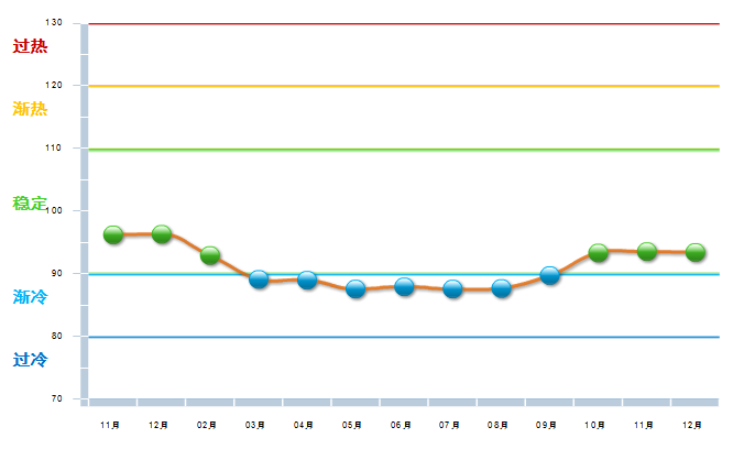 2013年11月至2014年8月中轻工艺美术景气指数处于基本稳定状态。2014年8月份中轻工艺美术景气指数开始出现较大幅度上升,自10月开始出现较大幅度下降,11月至12保持平稳。(参见图2)