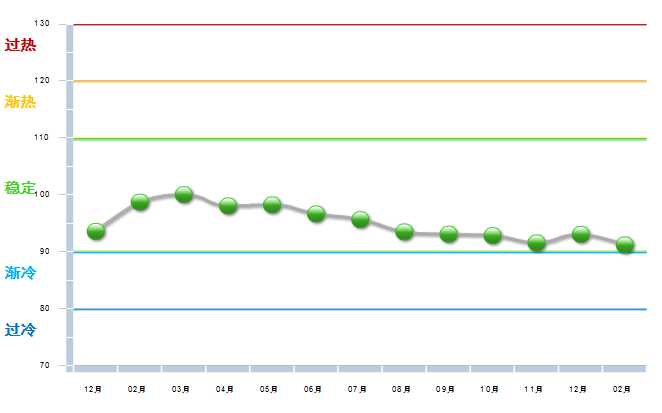 2013年12月至2014年8月中轻工艺美术景气指数处于基本稳定状态。2014年8月份中轻工艺美术景气指数开始出现较大幅度上升,自10月开始出现较大幅度下降,到15年2月已降至渐冷区域。(参见图2)