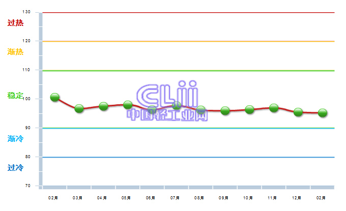 2015年2月,中轻玩具经济运行指数处于稳定区间,但依然呈现下探趋势。(参见图1-2)