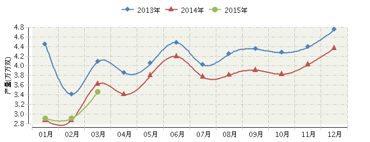 2015年全国皮革鞋靴行业连续三年月度产量对比