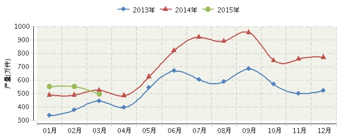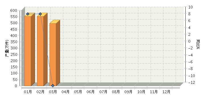 根据国家统计局公布数据,2015年1~3月,全国皮革服装行业累计完成产量1,581.72万件,同比增长5.68%。其中:3月份完成产量495.78万件,同比增长-11.9%。2015年月度数据走势及同比增长情况如下图所示。