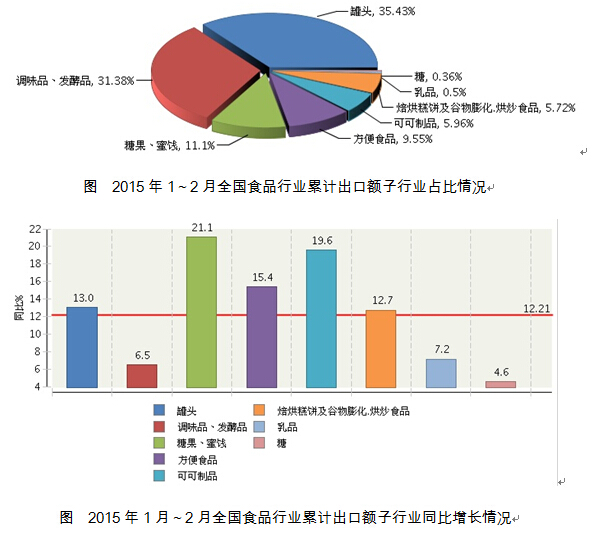 从各子行业出口情况来看,罐头累计出口额5.24亿美元,占食品行业出口总额的35.43%,同比增长13.05%;调味品、发酵品累计出口4.64亿美元,占31.38%,同比增长6.49%;糖果、蜜饯累计出口1.64亿美元,占11.1%,同比增长21.08%;方便食品累计出口1.41亿美元,9.55%,同比增长15.39%;可可制品累计出口0.88亿美元,5.96%,同比增长19.59%;焙烘糕饼及谷物膨化.烘炒食品累计出口0.85亿美元,5.72%,同比增长12.73%;乳品累计出口0.07亿美元,0.5%,同比增长7.16%;糖累计出口0.05亿美元,0.36%,同比增长4.6%