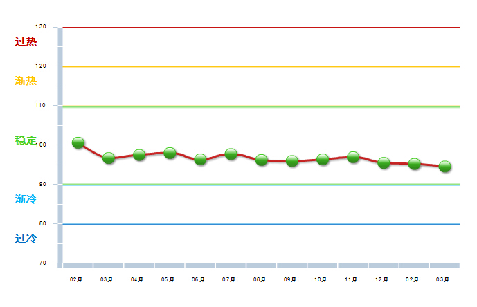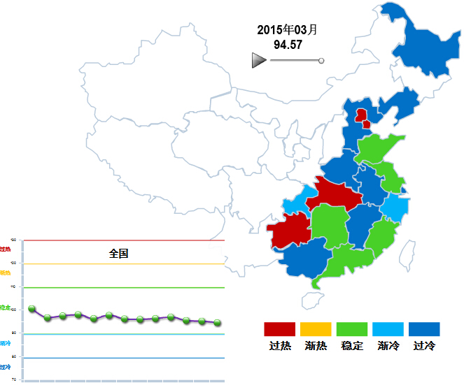 3月,北京、天津、贵州、湖北、四地区属于“过热”区间,与上去相比,增加了北京、天津、贵州;山东、江苏、福建、广西4个沿海省区以及湖南地区处于 “稳定”区间;浙江、重庆省区属于“渐冷”区间;“过冷”区间的地区数量是8个,分别是黑龙江、辽宁、河北、河南、安徽、江西、广西、上海。 (参见图1-3)