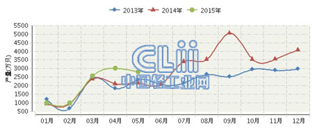 2015年1月~5月,江西荧光灯行业累计完成产量11,626.50万只,同比增长32.49%。其中:1月份完成产量1001.45万只,同比增长4.15%;2月份完成产量1001.45万只,同比增长4.14%;3月份完成产量2571万只,同比增长6.96%;4月份完成产量3021.6万只,同比增长42.71%;5月份完成产量2809.2万只,同比增长16.54%。