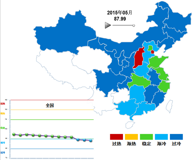 2014年4月至2015年2月,中轻皮革景气指数基本稳定,在90~100间小幅波动,处于稳定提示区的下半区。3月中轻皮革景气指数89首次跌入渐冷提示区,4、5月继续运行在渐冷提示区,预示皮革行业将面临困境(参见图3)。