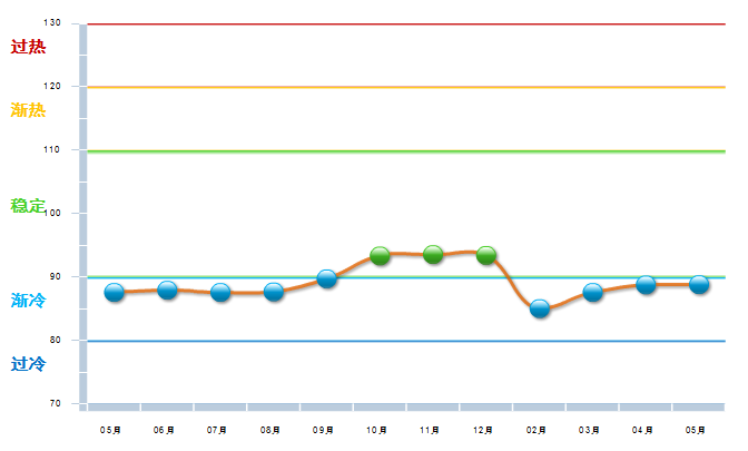2013年12月至2014年8月中轻工艺美术景气指数处于基本稳定状态。2014年8月份中轻工艺美术景气指数开始出现较大幅度上升,自10月开始出现较大幅度下降,到15年2月已降至渐冷区域,3月有所回升。(参见图2)