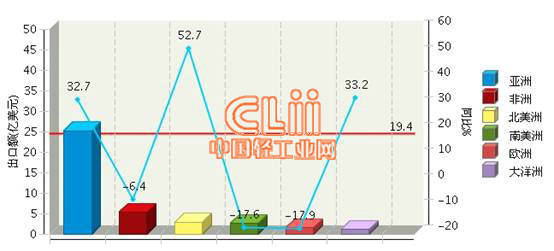 从出口增速看,对北美洲、大洋洲、亚洲出口额增幅均达30%以上;而对非洲、南美洲、欧洲出口均为负增长,其中南美洲、欧洲下降幅度较大,同比分别下降了17.60%、17.93%,详见图2。