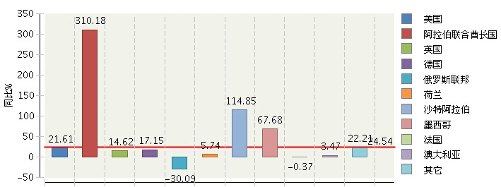 就增速来看,对阿拉伯联合酋长国的出口增长最快,同比增长310.18%,其次是沙特阿拉伯和墨西哥,同比分别增长114.85%和67.68%。