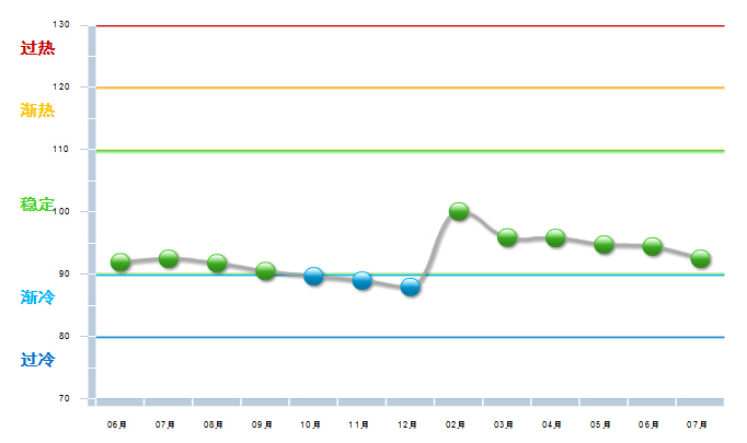 2015年2月五金行业利润景气指数出现了快速的提升,一下提高到“稳定”区域的中等水平,3月未能延续这一提升势,出现了一定的下滑,之后趋于平稳,各月指数逐月缓慢下行,7月下降趋势较为明显,接近“渐冷”区域边界线(如图)。