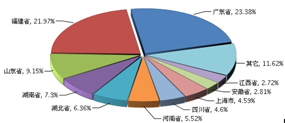从糖果生产地区分布情况看:产量比重仍集中在广东、福建等地区。其中:广东所占比重最大,共生产42.91万吨,占全国糖果总产量的23.38%, 比去年同期增长34.52%;福建居第二位占21.97%,产量40.32万吨,同比增长27.32%;广东省产量增长最快;上海产量同比下降0.36%。