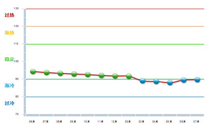 2014年6月至2015年2月,中轻皮革景气指数基本稳定,在90~100间小幅波动,处于稳定提示区的下半区。3月中轻皮革景气指数89首次跌入渐冷提示区, 6、7月虽然运行在渐冷提示区,但呈现企稳回升态势(参见图3)。