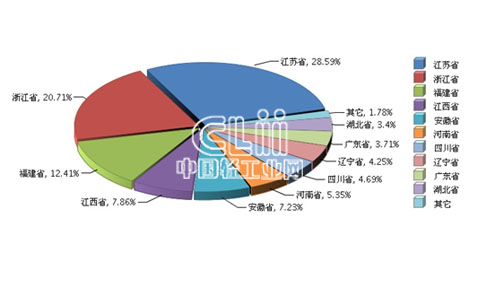 2015 年1~6月,全国荧光灯行业完成累计产量19.40亿只,同比增长-2.66%。产量排在前五位的区域依次是江苏、浙江、福建、江西和安徽。其中:江苏省完成累计产量5.55亿只(占28.59%),同比增长19.65%。