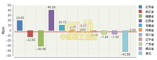 2015年1月~6月全国荧光灯行业累计产量主要地区同比增长情况
